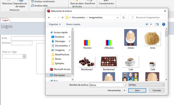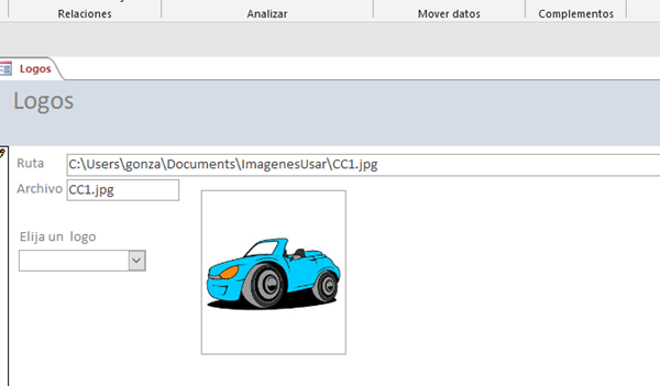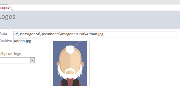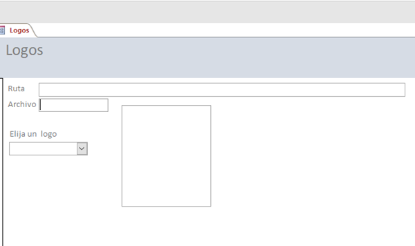 Es mucho más sencillo hacerlo que explicarlo. Vamos a suponer que tengo una tabla Logos con los campos IdLogo, Ruta, Archivo(aunque éste último no sería necesario). Con ella construyo un formulario, da igual único o continuo( aprovecho para poner también el combinado ElegirLogo)