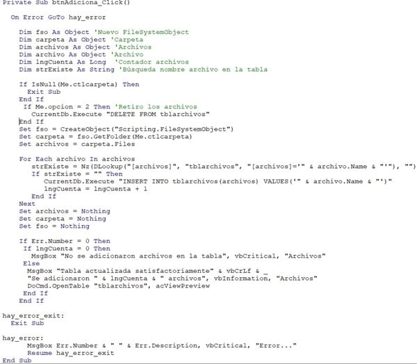Me gustaría extraer los nombres de archivos que contiene una carpeta y que se añadan a una tabla ya existente en Access.