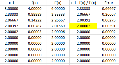 $$\begin{align}&x_{i+1}=x_i- \frac{f(x_i)}{f'(x_i)}\\&Cuando \ x_{i+1} - x_i < \text{ Error buscado, finaliza el enunciado y }x_{i+1} \text{ es la solución}\end{align}$$