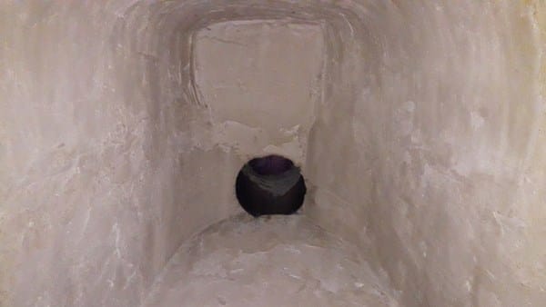 Y en esta cuarta foto me metí dentro de la chimenea para hacerle una foto a la salida de humos que tiene. El tubo de salida de humos está en la pared del fondo (parte inferior de la foto), y la chimenea acaba en el techo (parte superior de la foto). Esto me parece rarísimo, pero vaya, pregunto si esto se hace así... No se...