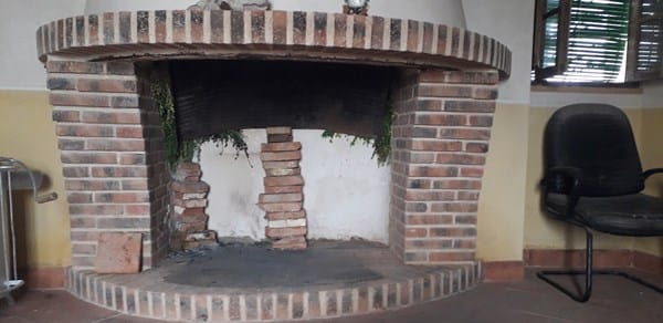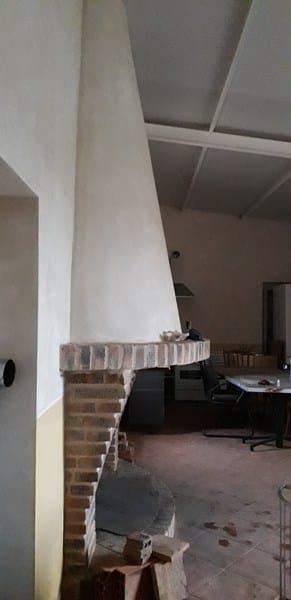 En esta segunda foto se ve toda la chimenea con la campana que tiene. Ahí podéis ver a mi vecino con todos sus aparatos de chimenea preparados. Tiene una estufa de leña preparada también.
