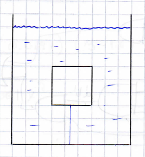 Un recipiente de 1 m de profundidad se coloca en un ascensor, a la base del recipiente se ha atado una cuerda de masa despreciable de 30 cm que impide que un bloque cúbico de 10 cm de lado, de densidad relativa 0.6, suba a la superficie (ver la figura). Suponga que el ascensor se mueve hacia arriba con aceleración a. (i) Determine la presión hidrostática a una profundidad h. (Ii) Determine la tensión de la cuerda. (¿Iii) Hay un valor de a que haga que el bloque vaya al fondo?