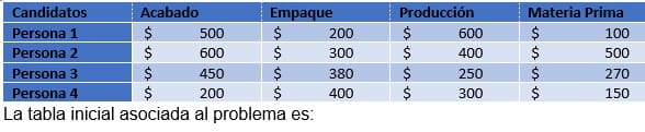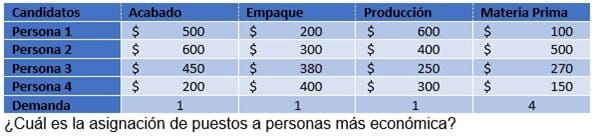 Una empresa contrata a cuatro personas para cubrir los siguientes puestos: supervisor de acabado, supervisor de empaque, supervisor de producción, supervisor de materia prima. A cada uno se aplica un examen de aptitudes para determinar sus habilidades. A partir del resultado de los exámenes se determina el costo que tiene su capacitación para cada uno de los puestos. Los costos se presentan en la siguiente tabla.