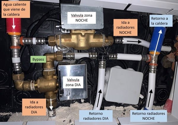 Como podéis ver en la imagen, la zona de noche tiene una válvula motorizada de dos vías. En cambio, la válvula motorizada de la zona de día es de tres vías.