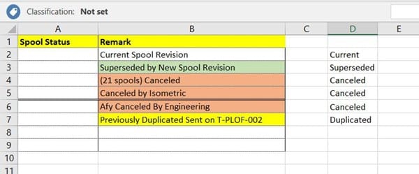 Mi columna A se titula "Spool Status", en ella debe aparecer en que estatus se encuentra la línea: