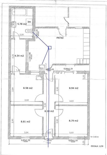 A ver si os hacéis idea con la foto y el plano (en azul recorrido de las tuberías de desagüe)