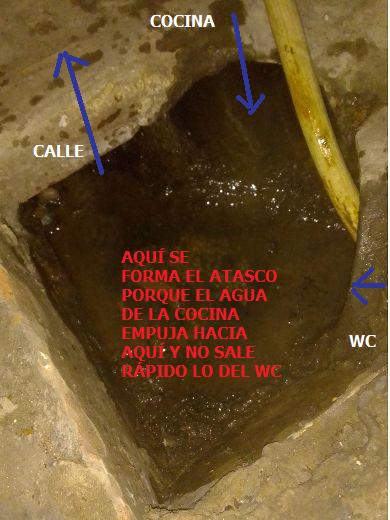 El caso es que al usar el grifo de la cocina o el del patio el agua va hacia la arqueta rudimentaria de forma que se forma ahí un tapón porque es como hace retroceder la suciedad(desde la cocina hacia la arqueta va en dirección contraria.
