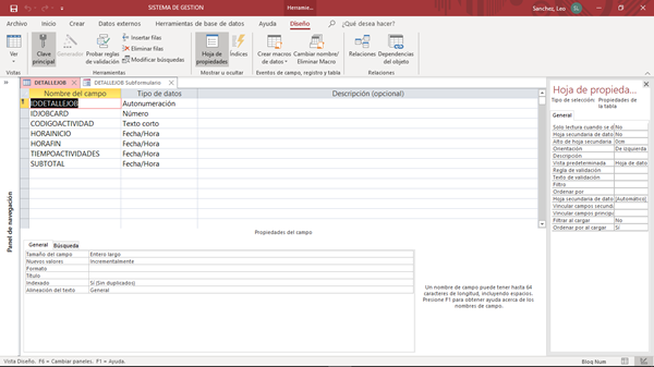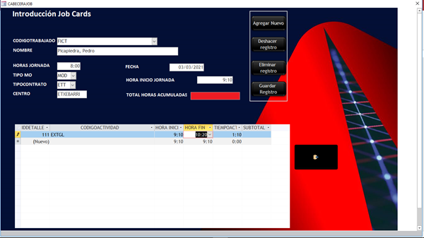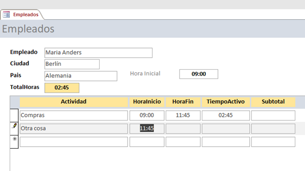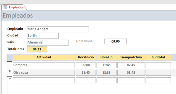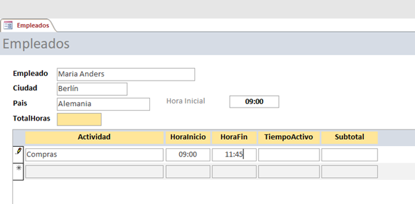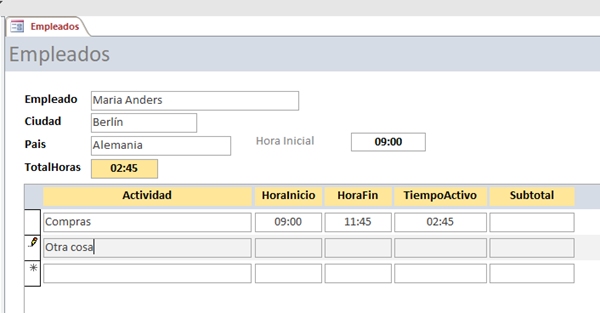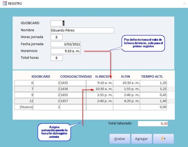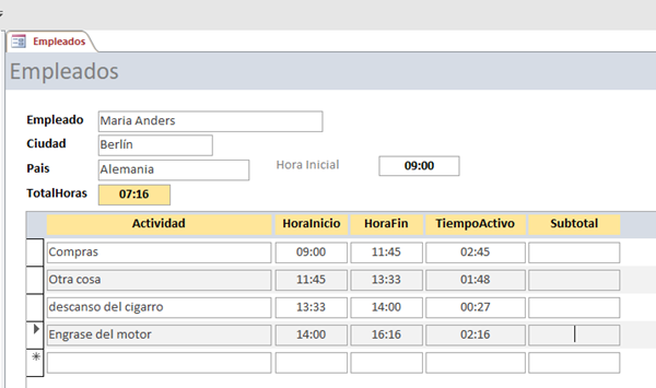 Quiero crear un formulario con subformulario para introducir las actividades diarias de unos trabajadores, en el formulario introduzco el código de trabajador y me llama a nombre, y resto de datos, me propone una fecha y una hora de inicio, además tengo un total para asegurarme de que el total de horas sumadas es igual a las horas de su jornada. La dificultad me llega a la hora de hacer el calculo de cada una de las actividades que meto en el subformulario, me gustaría informar solo de la actividad y de la hora de finalización de la misma y el resto de datos debería ser automático; hora de inicio, la primera línea que meta debe ser igual a la hora inicio jornada de la cabecera y el resto deberá ser igual a la hora de finalización de la línea superior, el tiempo de actividad es la diferencia de hora inicio y hora fin y el acumulado las sumas. Pero no se como hacerlo para el calculo del tiempo, ¿con un contador para saber el numero de línea?
