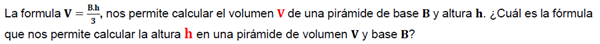 La formula ? = ?.?, nos permite calcular el volumen ? De una pirámide de base ? Y altura ?. ¿Cuál es la fórmula que no