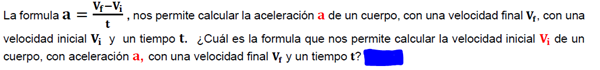 La fórmula? =?−?, nos permite calcular la aceleración? De un cuerpo, con una velocidad final?, con unaveloci