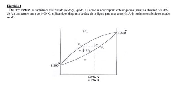 ... Determinar las cantidades relativas de solido y liquido, así como sus correspondientes riqueza, para una aceleración de 60% de A a una temperatura de 1400 °C, utilizando el diagrama de fase de la figura para una aleación A-B totalmente soluble en estado solido.
