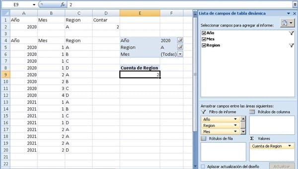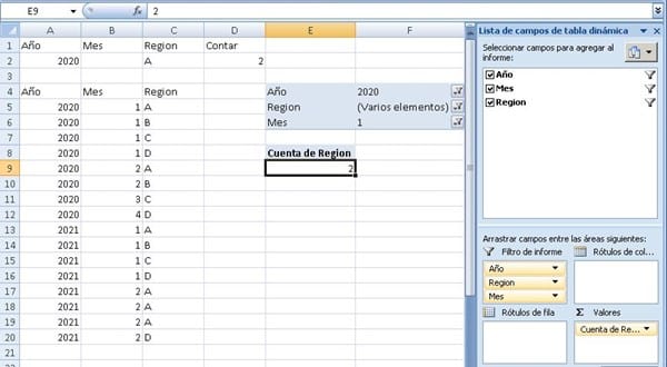 El inconveniente es que si quiero solo tener el parámetro de año (no mes y Región) quisiera que me cuenta la cantidad del año, y a medida que aplique los otros valores vaya contando según esos criterios.