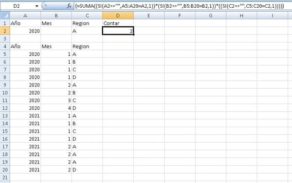 Quiero contar un rango dependiendo de 3 items, celda A1 = Año, B1= mes y C1 = Region. Para ello estoy utilizando la función "contar.si.cojunto"