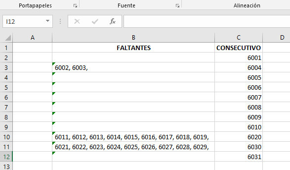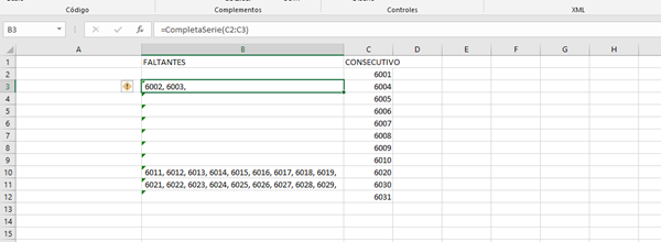 Public Function CompletaSerie(r As Range) As String Dim c As Range Dim cs, rs As Integer Dim s As String For Each c In r If c.Value = "" Then s = "La serie no debe tener celdas en blanco" GoTo fin End If Next c rs = r.Rows.Count cs = r.Columns.Count For i = 1 To rs For j = 1 To cs a = r.Item(i, j) If i + 1 <= rs Then b = r.Item(i + 1, j) While b <> a + 1 And a + 1 <> "" s = s & Str(a + 1) & "," a = a + 1 Wend End If Next j Next i fin: CompletaSerie = s End Function