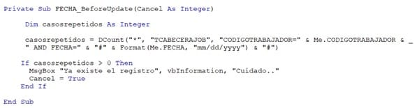 Tengo un formulario "Fcabecerajob" para introducir datos en una tabla Tcabecerajob, necesito asegurarme de que no introduzco la misma tarjeta dos veces, para ello he pensado utilizar Dcount para contar si el campo "codigotrabajador" y el campo "fecha" ya existen en la tabla y en ese caso que salga un mensaje avisando que ya existen datos del mismo trabajador el mismo día. Y que NO se grabe nada en la tabla y que No me deje pasar al subformulario.