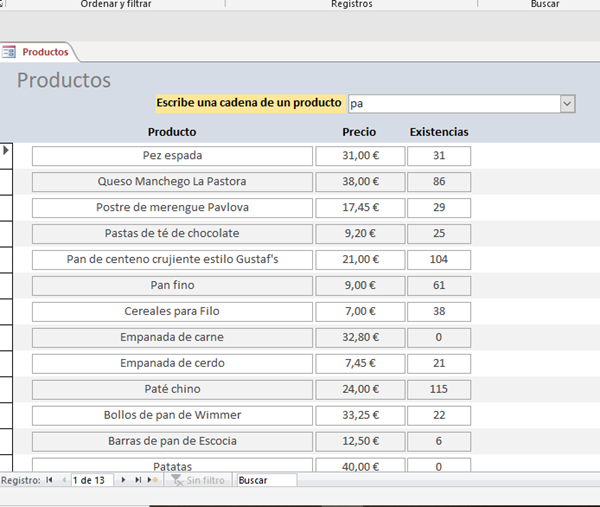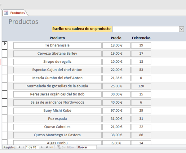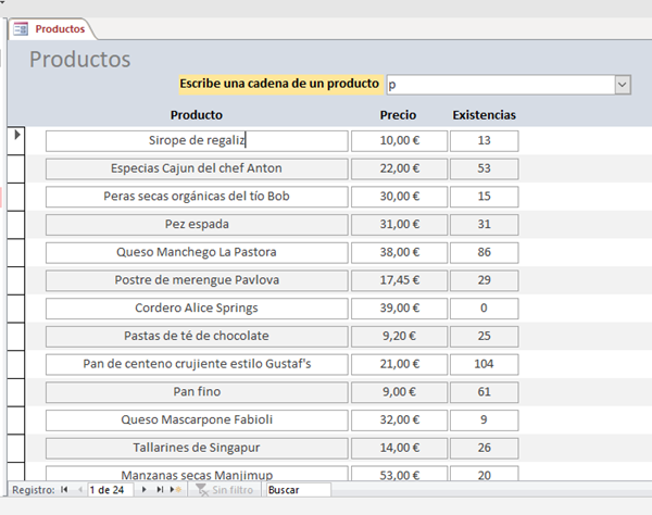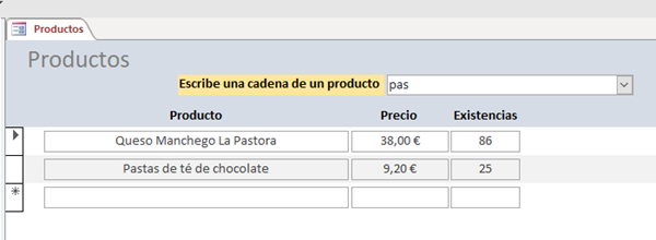 Tengo un formulario que he de buscar a medida que se esta escribiendo en un campo de selección (Encuentra) los productos con un Nombre coincidente.