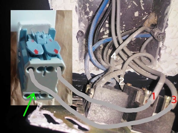 Tienes que usar el de cuatro, soltar los cables del viejo y según te he marcado los números meterlos en el nuevo. Tendrás que pelar los cables un poco más de lo que están, tienes la referencia marcada en verde. Pulsas la pestaña correspondiente, metes el cable y sueltas.