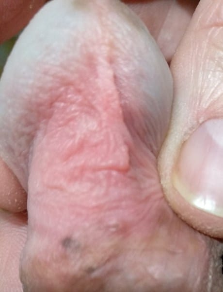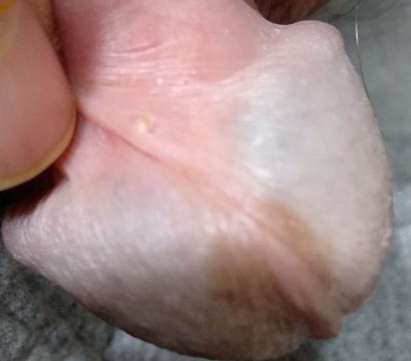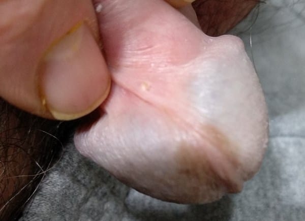 Hace dos meses empecé a sentir molestias en el pene, creí que era algún episodio de Balanitis como los que me ocurrían en el pasado, una vez cada 4-5 años, pero al mirar la zona solo observe una pequeña benita ligeramente inflamada en el glande, a 2 mm de la uretra, pero me ponía crema anti inflamatoria y antibiótica y no sentía mejora, hará cosa de dos semanas descubrí casi pegado al frenillo esta pequeña ulceración, no se si tendrá que ver con que hace unos ocho meses estaba orinando y de pronto sonó el teléfono, y cerré de golpe la cremallera del pantalón, y me pille la zona del slip y el pene, sentí un pequeño tirón que me dolió, pero en principio no vi sangre, así que me olvide de ello, pero hace dos semanas aparte de la pequeña benita inflamada al lado de la uretra, observe mirando más detalladamente, que aparte de esa pequeña ulceración de la foto al inicio del frenillo, me note también, unos pequeños nódulos o quistes en la zona media del frenillo y en la base del frenillo, uno en cada lugar, yo creo que lo que más me escuece y no acaba de curar, es la ulceración del inicio del frenillo, tengo pedida cita telefónica para la semana que viene con el medico de familia, para solicitarle cita con el Urólogo, pero creo que no me la darán por el tema actual del virus, que lo acapara todo, mientras tanto he probado varias cremas de todo tipo y nada parece funcionar
