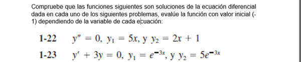 Compruebe que las funciones siguientes son soluciones de la ecuación diferencial dada en cada uno de los siguientes problemas, evalúe la función con valor inicial (-1) dependiendo de la variable de cada ecuación