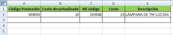 Entonces al momento de modificar los precios desde un excel que me envía mi proveedor, tengo que armar una planilla con MI código y SU costo... Es decir, 2 columnas en las que figuren: