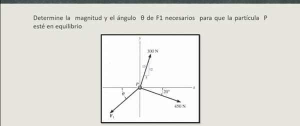 ¿Determinar la magnitud y el ángulo de F1 necesarios para que la partícula P este en equilibrio?