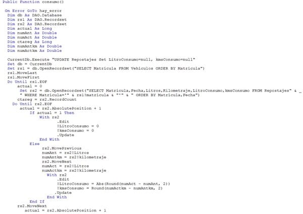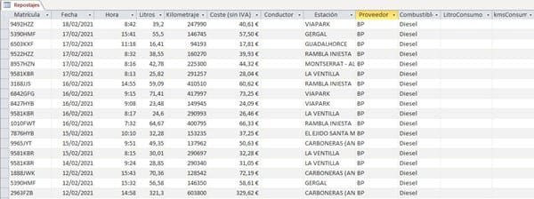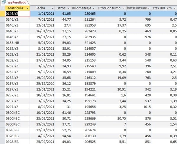 Tenemos el problema de que el repostaje más antiguo de cada matrícula que haya en la tabla no va a tener kilometraje de un repostaje anterior para hacer el cálculo, entonces si fuese necesario podría ponerse en otra tabla que se llama Vehículos el kilometraje inicial del anterior repostaje de cada vehículo.