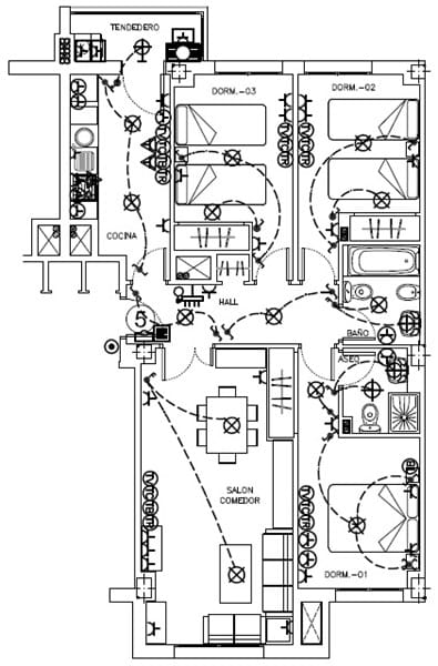 - La pared que separa el Salón/Comedor y el Dormitorio 01 está formada por: Yeso + Ladrillo Hueco Doble + Aislamiento + Tabicado + Yeso.