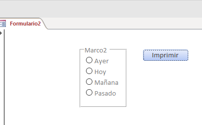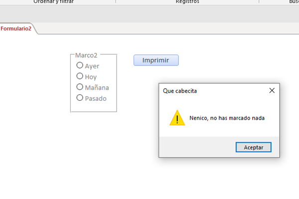 Tengo un formulario (FAlcoholemias) en el cual he insertado un grupo de opciones (Marco320), con tres botones y un botón de comando para imprimir (cmdImprimir). Lo que pretendo es que si no tengo marcada ninguna opción del grupo de opciones me salte un mensaje diciéndome que no he seleccionado ninguna opción para lo cual tengo lo siguiente, en el botón (cmdImprimir) he insertado la siguiente instrucción: