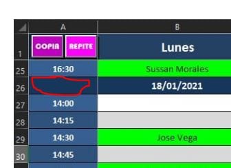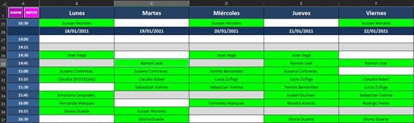 Tengo una tabla en donde se van repitiendo semanas, con cada fecha arriba, y los horarios a la izquierda. En las celdas anoto nombres que se repiten. Entonces la idea es obtener una pequeña tabla con esas fechas y horarios para cada vez que aparezca un nombre específico.