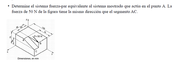 El sistema equilibrante reducido te quedaría ...........F= 50 N aplicada paralelamente en el punto A + Momento = 1387.5 i + 1395 k.