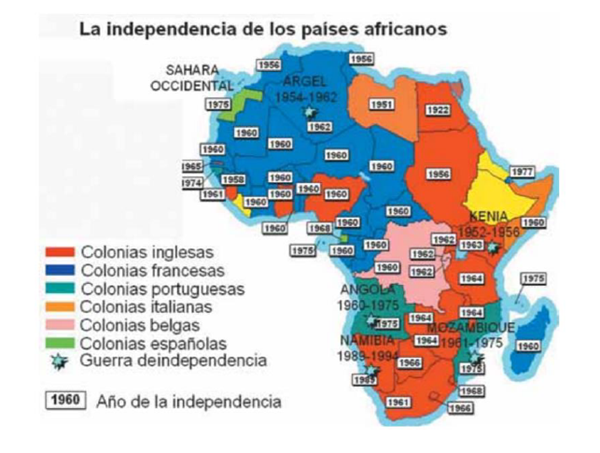 Identifica entre qué años los países africanos logran su independencia. ¿Cuál fue el primer y último país en alcanzarla?