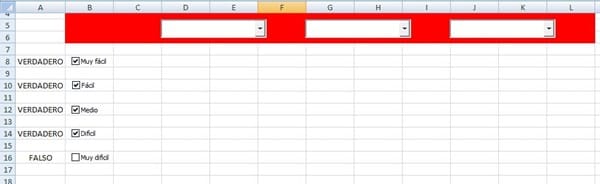 Se me ocurrió asignarles nombres a los subgrupos: muyfacil, fácil, medio, difícil, muydifil. Las casillas de verificación se vinculan a las celdas A8, A10, A12, A14, A16