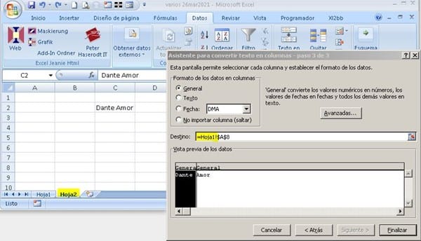 Sé que para dividir apellidos de una misma celda de Excel se usa la función "Texto en columnas", hasta ahí sabría como hacerlo. El caso es que pretendo sacar los datos de una celda en la que hay dos apellidos y pasarlos a otras dos celdas en las que tendrían que aparecer dichos apellidos separados y en mayúsculas, estas celdas de destino estarían en el mismo archivo pero en diferentes pestañas.