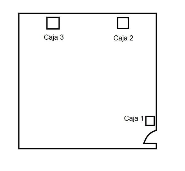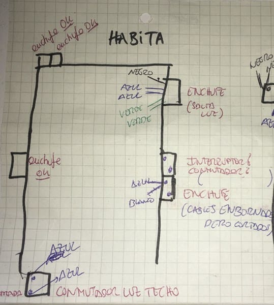 Te envió un plano descriptivo de una habitación tipo para que nos indiques si hay las tres cajas, dos o una sola. Los mecanismos que tenías en cada caja. Los cables que hay en cada caja y sus colores.