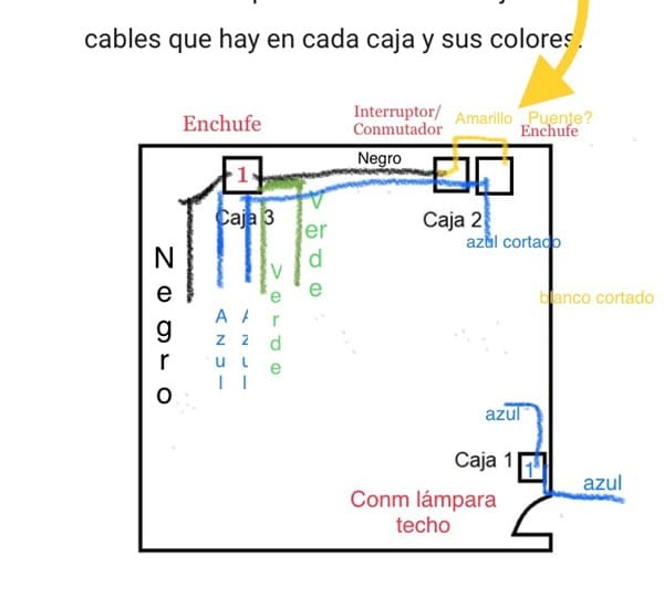 Por favor dibuja un croquis de donde estan y en que numero los mecanismos que hay en la habitacion, que cableado hay en cada caja y en que numero. Por ejemplo, dibuja la habitacion como un cuadrado y deja sin linea donde va la puerta; dibuja al lado de la puerta la primera caja del interruptor e indica cuantos cables hay y de que color; luego dibula igualmente las otras cajas e indica tambien el cableado existente y su color. Sube una foto de ese croquis. No te preocupes aunque vaya a mano alzada. No se trata de un examen de dibujo tecnico sino de hacernos un idea de lo que hay en la instalacion.