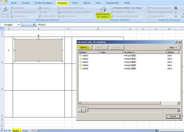 PASO 7. Agregamos un nombre para esa foto1. Selecciona del menú Fórmulas, Administrador de Nombres, en la ventana presiona el botón Nuevo