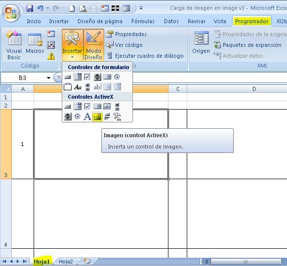 PASO 5. En la misma Hoja1, en la celda B3 inserta un control Image de ActiveX. Después de seleccionar el icono de Imagen, presiona click en la celda B3 y arrastra para hacer grande el control Image.