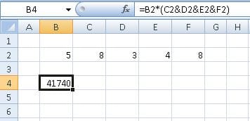 Tengo en estas celdas B2, C2, D2, E2, F2 estos números 5 8 3 4 8 intente unir 8348 y multiplicarlo por 5