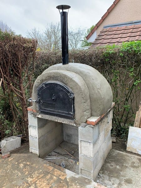 Tengo casi terminado un horno de leña que he ido haciendo poco a poco sin experiencia en la materia. Sobre la marcha viendo videos en Internet y comprando material poquito a poco. He hecho un horno de ladrillo refractario sobre una "mesa" de ladrillos de hormigón cuya tabla está hecha de ladrillos refractarios sobre mortero refractario igualmente. La tabla de la mesa la componen : 2 planchas de hormigón armado de 4 cm en paralelo + motero refractario + ladrillo refractario de 5 cm.