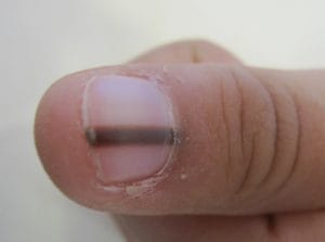 I. Hola Leafar, aunque no soy experto diría que se asemeja a un trastorno de la uña llamado 'melanoniquia', perteneciente a la familia de trastornos de pigmentaciones ungueales, aquí puede ver una imagen de su aspecto y un poco de información,