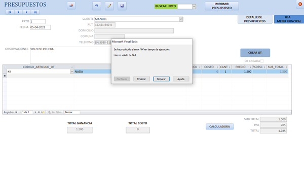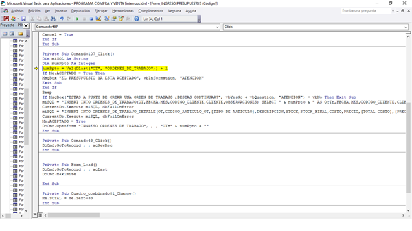 Quería pedirles si me pueden ayudar con un código para pasar los datos del formulario presupuesto a el formulario orden de trabajo. Ahora no me funciona y no se lo que puede ser. Estuve realizando unas depuraciones a algunos códigos de vba y parece que borre algo que no me di cuenta y este código dejo de funcionar. La linea en negrilla es la que arroja error. En la imagen no se aprecia todo el código así que lo copiare y lo pegare. De antemano gracias