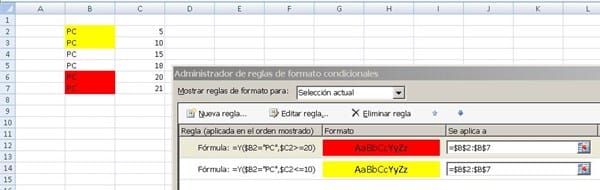 Si en la columna B se escribe PC y su valor en la columna C es <=que 10 la celda se rellena con Amarillo.