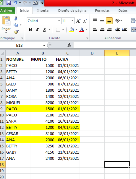 Deseo que en el archivo 2, se pinte de amarillo nombres-monto-fecha que se repitan del archivo 1, más no los mismos nombres que tengan monto y fecha diferente