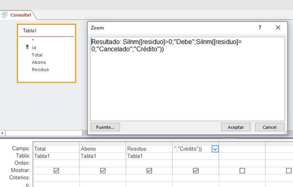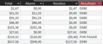 Resultado: SiInm([Residuo]>0;"DEBE";SiInm([Residuo]=0;"Cancelado";SiInm([Residuo]<0;"Crédito";"POR PAGAR")))