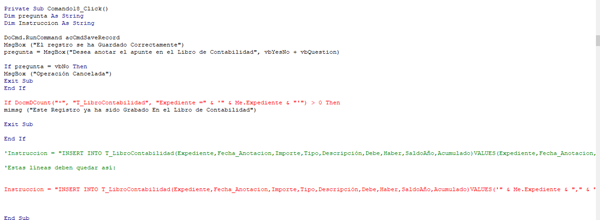 Necesito codificar un botón para guardar registros y que me pregunte si quiero pasarlo al libro, en caso afirmativo ejecute una instrucción inset Into, lo he intentando pero me da error, y nno se donde me he equivocado.