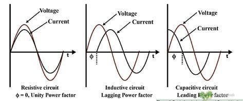 Si tu solo tienes una resistencia en un circuito se mantiene el voltaje y el amperaje (corriente) igualados, es decir no se desfasan, y por tanto el factor de potencia es máximo (primera gráfica) pero si colocas una bobina (segunda gráfica) o un condensador (tercera gráfica) la corriente se atrasa o se adelanta respecto del voltaje (hablamos siempre de corriente alterna), Estos filtros EMI colocan unas bobinas y un condensador apropiados para corregir el desfase y mantener el factor de potencia al máximo, pero haciéndolo pasar por un condensador haciendo que los armónicos desaparezcan.