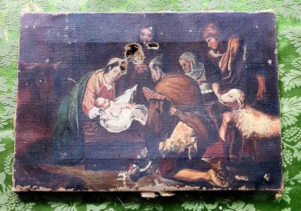 Tengo esta pintura de tema religioso. El lienzo está roto en algunas zona. Su origen es un convento en Sevilla y sus medidas son 24 x 34. Muchas gracias de antemano. Un saludo.