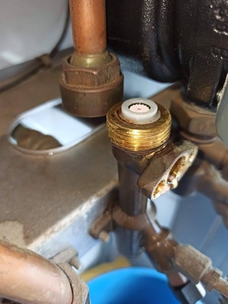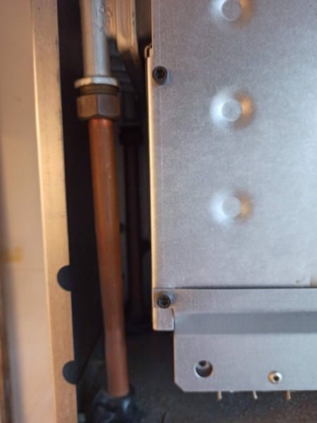 Al quitar la tubería de cobre que está sobre el flotador magnético para cambiarlo, se afojó un poco la tuerca del otro extremo de esa tubería, y ahora hay una pequeña fuga de agua. El problema es que esa tuerca queda dentro del compartimento estanco, al fondo a la izquierda, detrás de otra tubería, y el acceso es muy difícil, no me cabe la mano. ¿Sabes si hay algún modo de acceder a esa tuerca? Parece bastante complicado, como si hubiera que desmontar toda la caldera.