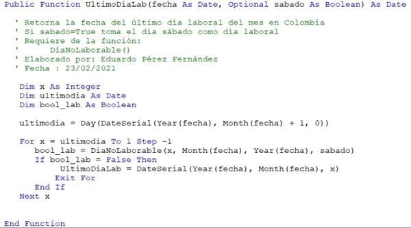 ¿Determinar la fecha del ultimo día laborable del mes y el nombre del día en colombia?