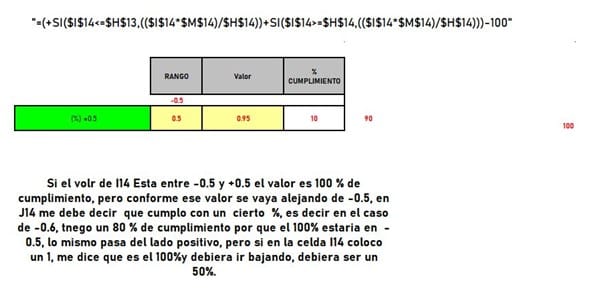 Si el valo esta entre un rango de +0.5 y -0.5, el cumplimiento es 100%, pero si se encuentra por arriba de los rangos este valor debe disminuir a un 90, 80 70 % de cumplimiento. Hasta el punto que sea 0% el cumplimiento. Tengo una fórmula pero al llegar a 1 en el valor a evaluar me da 100 %, cuando debe ser un 50% de cumplimiento. Si alguien me puede apoyar por favor le comparto la hoja de excel. Gracias